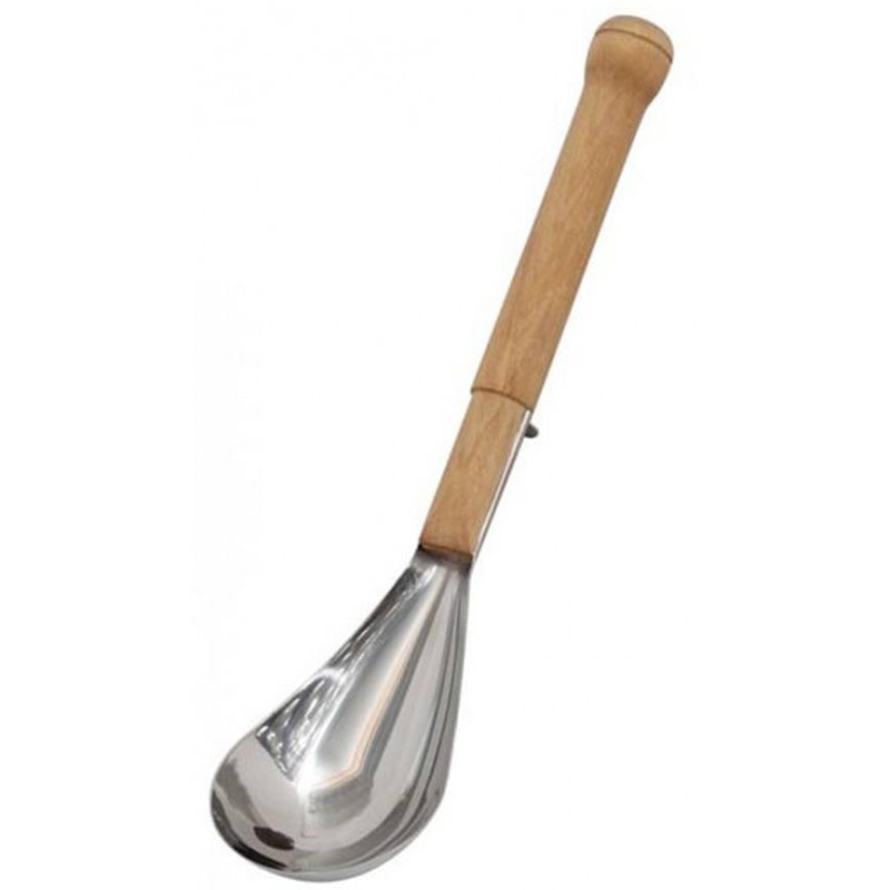 Un cucharón de acero inoxidable y madera