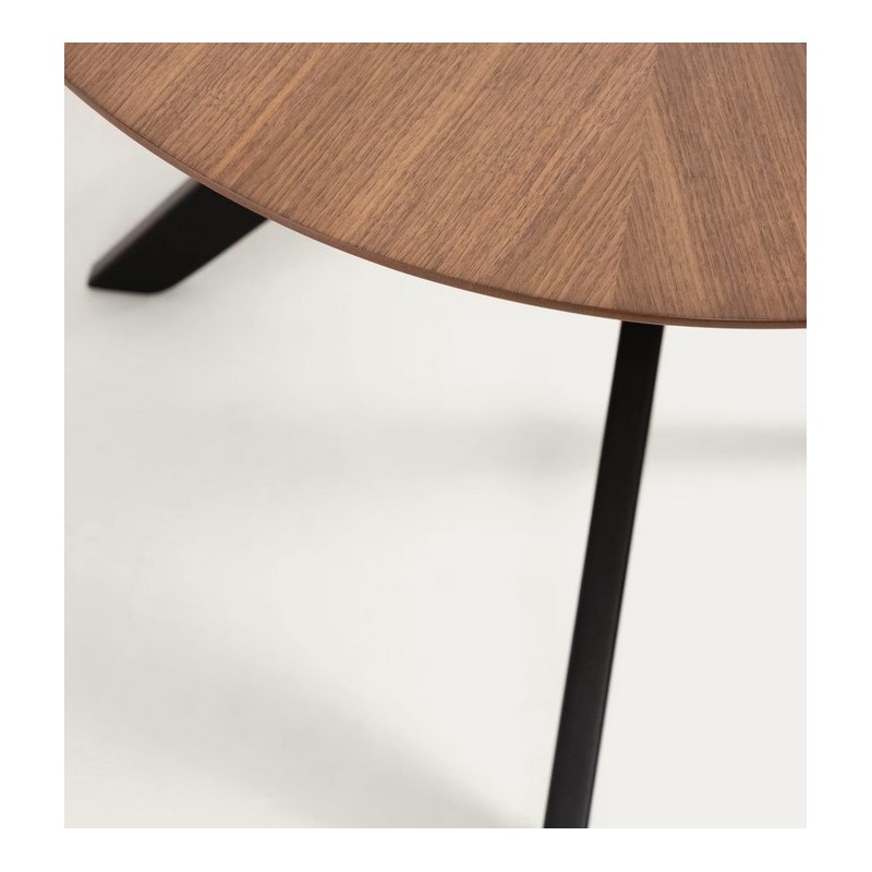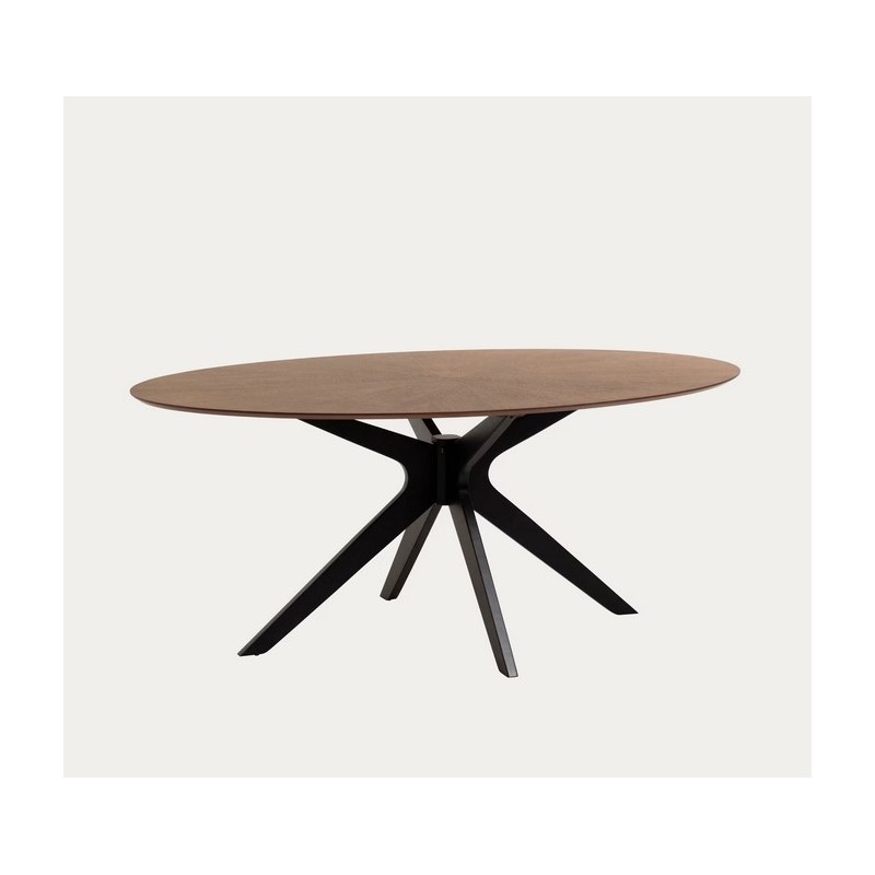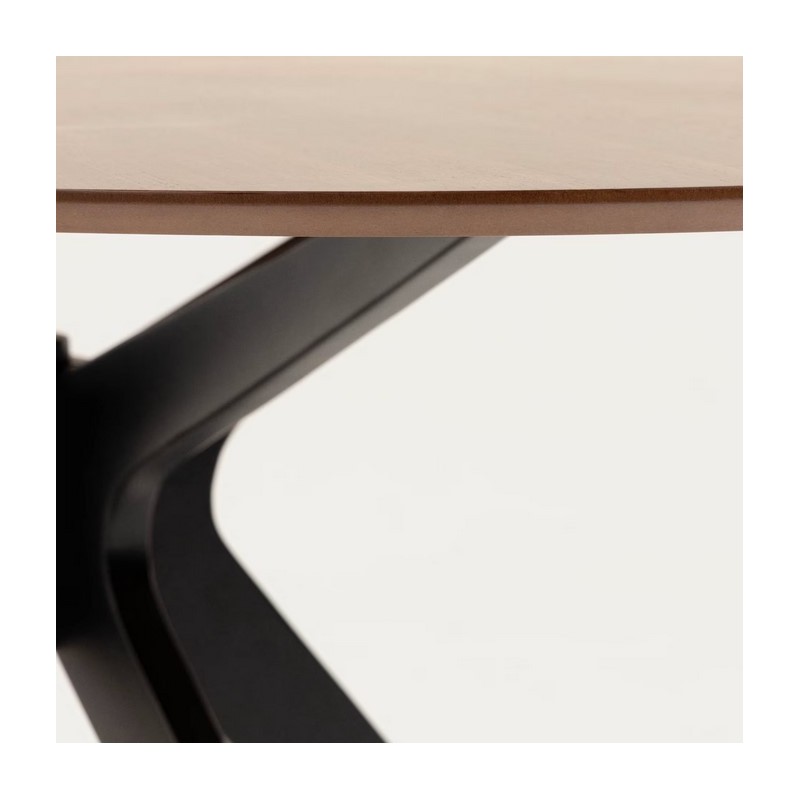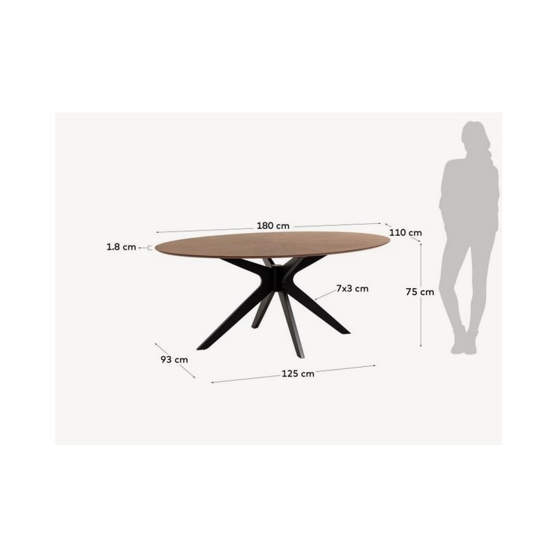 Tavolo ovale con piano superiore in MDF impiallacciato, impiallacciato noce. Gambe in legno di gomma tinto nero.